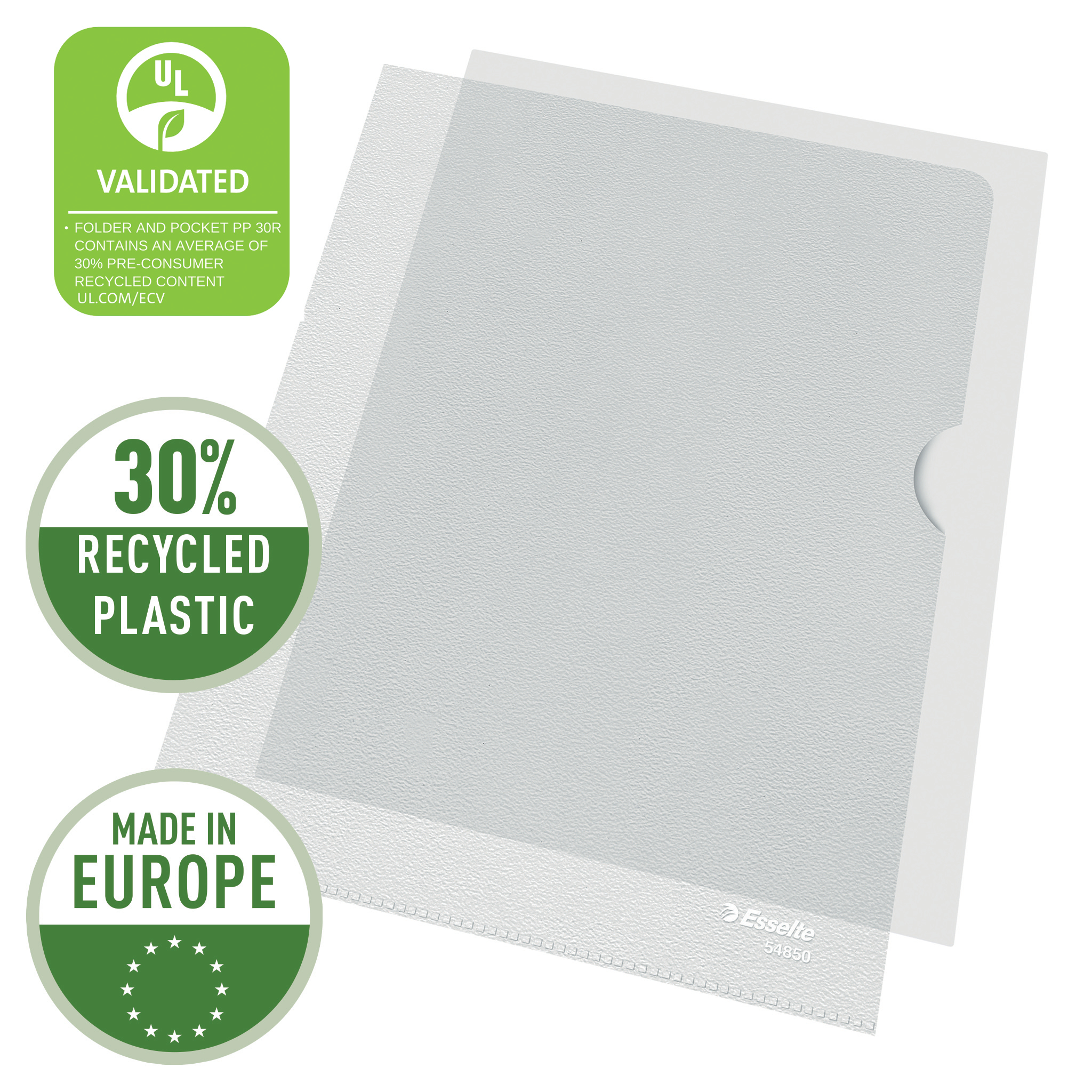 Esselte Sichthülle Standard Plus, A5, oben und rechte Seite offen, genarbt, mit Greifausschnitt. Material: recycelbares Polypropylen (PP) 0,11 mm. Format: 160 x 220 mm. Inhalt: 100 Stück. Farbe: farblos.