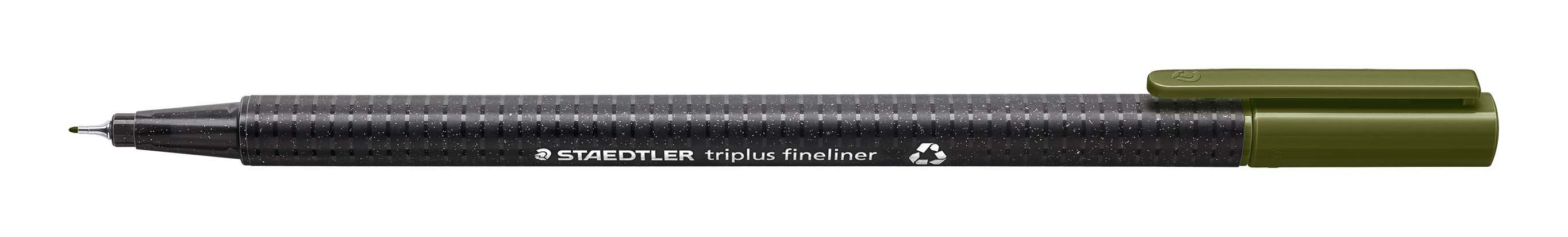 Feinschreiber triplus® fineliner, Ausführung der Griffzone: ergonomischer Dreikant-Schaft für entspanntes Schreiben, Material des Clips: Kunststoff. Fasermaler mit ergonomischem Dreikantschaft für entspanntes Schreiben und Malen, Stabile, eindrucksichere Spitze, Kappe mit Atemluftkanal nach ISO 11540 und BS 7272-1/2, DRY SAFE - kann tagelang offen liegen ohne einzutrocknen, Tinte auf Wasserbasis, Leicht auswaschbar aus den meisten Textilien, PP-Schaft garantiert lange Lebensdauer, Linienbreite ca. 1,0 mm, Mix & Match Eigenschaft in Kombination mit dem Modell 323, Gehäuse aus 97% recyceltem Plastik. Ausführung Stift:. Typbezeichnung der Mine: Tintenspeicher, Farbe des Schaftes: anthrazit, Farbe der Kappe: in Tintenfarbe. Ausführung Spitze: Ausführung der Spitze: Faserspitze (Rund), Strichstärke: ca. 0,3 mm. Ausführung Schreibflüssigkeit: Tinte auf Wasserbasis, kann einige Tage offen liegen bleiben ohne einzutrocknen, Schreibfarbe von Schreibgeräten: olivgrün. Ausführung des Inhalts mit Packung: Schachtel mit 10 Stück
