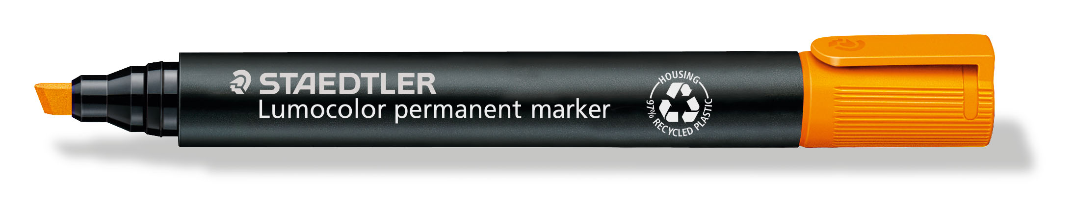 Permanentmarker Lumocolor®. Schaft und Kappe aus 97% PP-Rezyklat garantieren lange Lebensdauer, blockierte Spitze, einfaches Nachfüllen mit Tankstelle 488 50. Für fast alle Flächen. Sekundenschnell trocken, daher ideal für Linkshänder. Ausführung Marker: Material des Schaftes: 97% aus PP-Rezyklat-Kunststoff , Clip vorhanden, Kappe umsteckbar. nachfüllbar, Farbe des Schaftes: schwarz. Ausführung Spitze: Ausführung der Spitze: Faserspitze (Keil), Strichstärke: ca. 2 oder 5 mm. Ausführung Schreibflüssigkeit: geruchsarme Tinte, xylol- und toluolfrei, Schreibfarbe von Schreibgeräten: orange, wasserfest, lichtbeständig gegeben, kann einige Tage offen liegen bleiben ohne einzutrocknen. Ausführung des Inhalts mit Packung: Schachtel mit 10 Stück