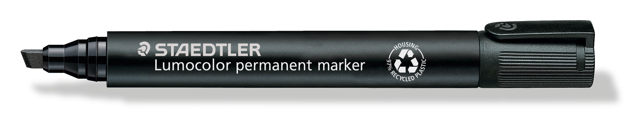 Permanentmarker Lumocolor®. Schaft und Kappe aus 97% PP-Rezyklat garantieren lange Lebensdauer, blockierte Spitze, einfaches Nachfüllen mit Tankstelle 488 50. Für fast alle Flächen. Sekundenschnell trocken, daher ideal für Linkshänder. Ausführung Marker: Material des Schaftes: 97% aus PP-Rezyklat-Kunststoff , Clip vorhanden, Kappe umsteckbar. nachfüllbar, Farbe des Schaftes: schwarz. Ausführung Spitze: Ausführung der Spitze: Faserspitze (Keil), Strichstärke: ca. 2 oder 5 mm. Ausführung Schreibflüssigkeit: geruchsarme Tinte, xylol- und toluolfrei, Schreibfarbe von Schreibgeräten: schwarz, wasserfest, lichtbeständig gegeben, kann einige Tage offen liegen bleiben ohne einzutrocknen. Ausführung des Inhalts mit Packung: Schachtel mit 10 Stück